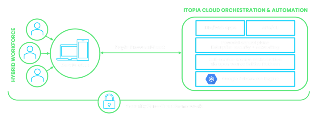 - Integrate with ease. itopia is “no hoops” computing. Enterprise-grade security and compliance with no back-end tech.